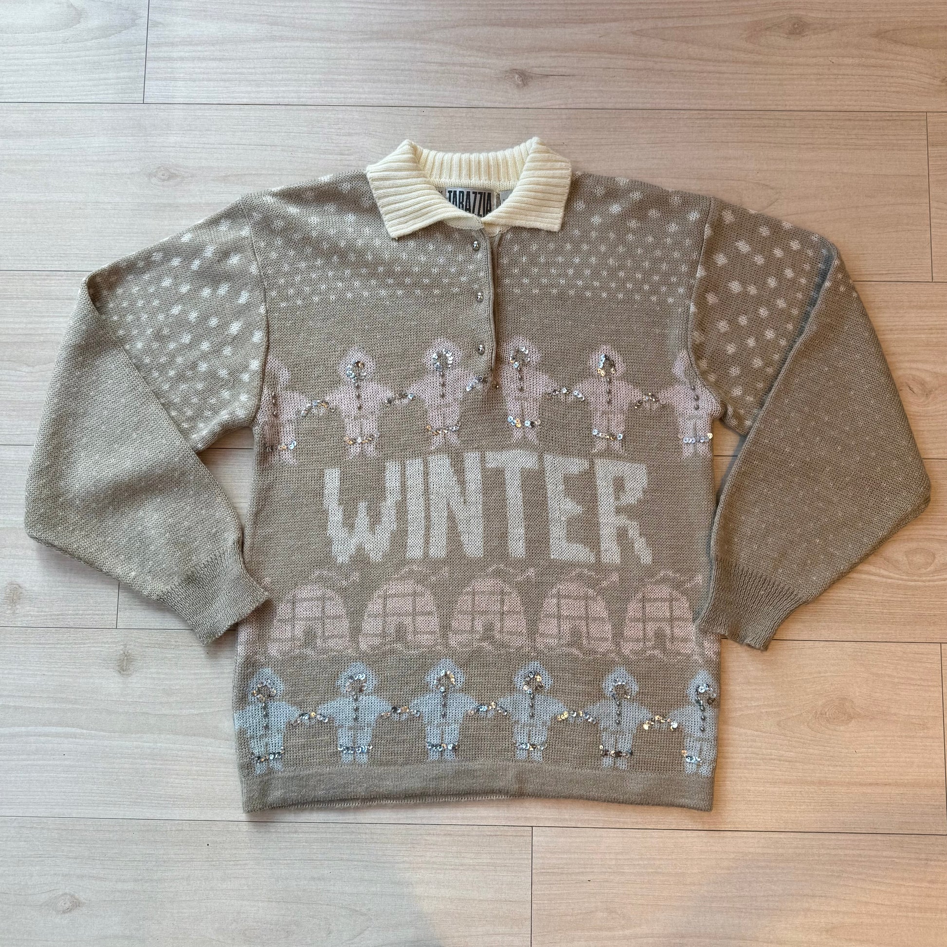 Fun light tan with pastel pink and blue accent novelty print Winter sweater, features sequin accents. 1980s, acrylic blend.