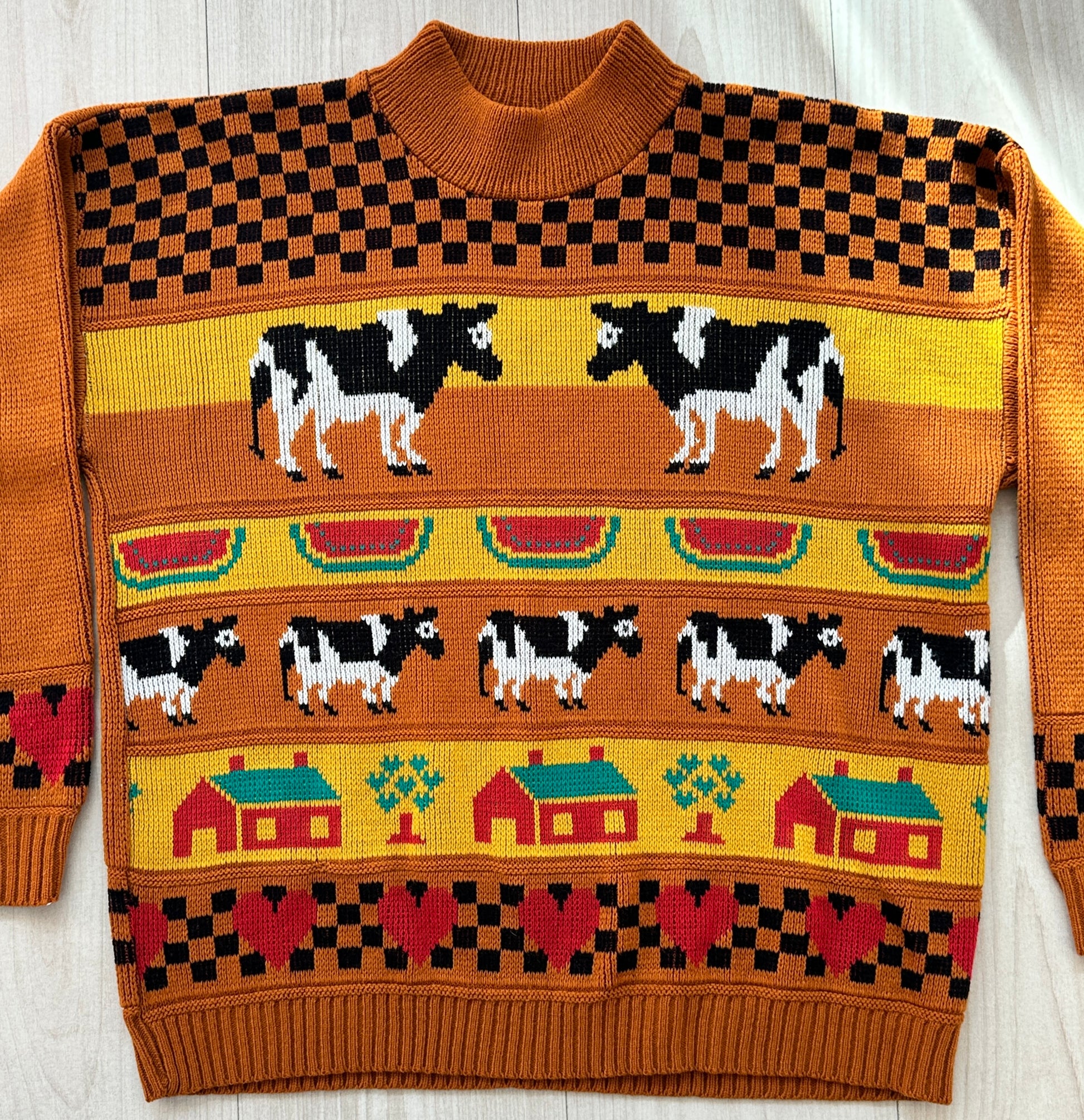 Cutest and whackiest cow and farm print mock neck sweater, featuring cows, hearts, watermelon, checkerboard patterns, and little farmhouses on a deep orange background. 90s, acrylic.